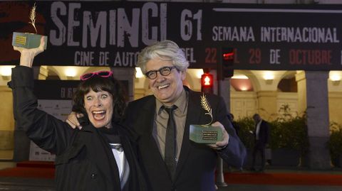El gallego Chema Prado -exdirector de la Filmoteca Española- recibió ayer el homenaje de la Seminci, certamen que le concedió una de sus Espigas de Oro de Honor. El otro reconocimiento tuvo como protagonista a la veterana actriz Geraldine Chaplin. En la imagen, ambos posan sonrientes con sus estatuillas.