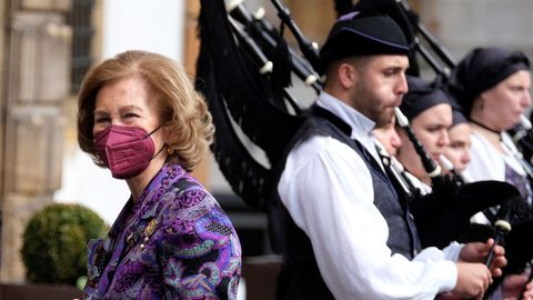 La madre de Felipe VI, que el próximo 2 de noviembre cumple 83 años, ha llegado al Hotel Reconquista en medio de los acordes de la banda de gaiteros que le han dado la bienvenida en el exterior del edificio.