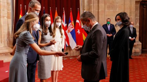 Tras esta audiencia, los reyes y sus hijas reciben a los miembros protectores de la FPA y, posteriormente, a los galardonados con los Premios Princesa de Asturias de esta edición, junto a los miembros del jurado y de los patronatos Princesa de Asturias.
