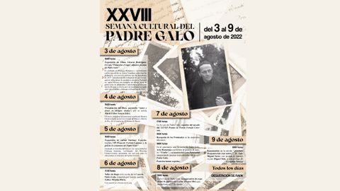 El sábado tendrá lugar un Taller de Rapa en la cocina de Padre Galo, impartido por Esther Méndez Heras. Otra de las actividades destacadas será el XXVIII Premios de Poesía Fernán Coronas y el acto homenaje ante la tumba del Padre Galo. También, el lunes 8, tendrá lugar la inauguración de la exposición de pintura de Carlos Álvarez Hirt, que durará hasta el 17 de agosto. Y, el día 9, la presentación de la novela «¿Cuándo desaparecerán esas nubes?» de Luis Miguel Torre. Además, todos los días, en la carpa habrá una degustación de Rapa.