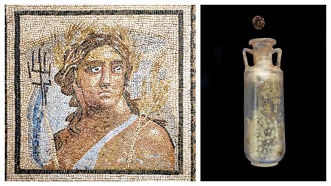 En una de las urnas, fabricada en vidrio, sobre los restos óseos cremados del difunto, en este caso una mujer de entre 30 y 40 años, se había depositado una bolsa de tela que contenía tres cuentas de ámbar y un pequeño frasco o ungüentario de cristal de roca (cuarzo hialino) tallado en forma de ánfora.