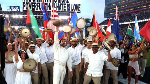 Bad Bunny terminó su actuación en la Super Bowl mostrando un balón de fútbol con el mensaje:«Juntos, somos América», que impactó finalmente sobre el campo mientras se marchaba al ritmo de la pegadiza Debí tirar más fotos. Además, durante el espectáculo, mientras camina frente a la cámara rodeado de banderas de distintos lugares de América, es visible en la pantalla del estadio a su espalda en grandes letras: «The only thing more powerful than hate is love» («La única cosa más potente que el odio es el amor» en castellano).