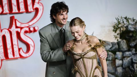 Robbie es además, junto a Zendaya —ahí, la mimetización con el universo Dune a través de estilismos futuristas y la adopción del tenniscore antes del estreno de Rivales—, la reina del método. La actriz ha pasado de jugárselo todo al rosa, resistiéndose a dejar atrás a Barbie, a abrazar el romanticismo gótico —literalmente encorsetada ella, todo brazaletes y encajes— para lucir cual Catherine Earnshaw. A su vera, en cada aparición pública, un galante Elordi le tiende la mano para sostenerla, recoge su vestido para evitar que tropiece y la cubre con sus enormes manos para que no se moje.