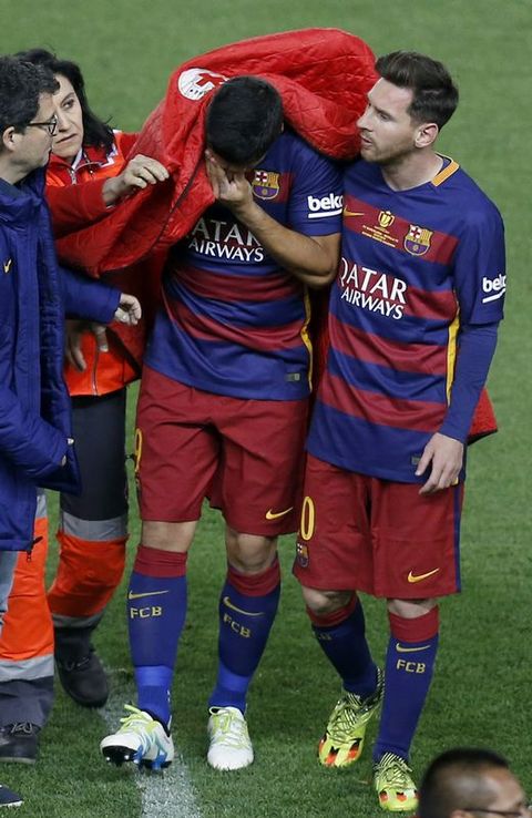 Su final llegó en el 53', cuando estiró tanto la pierna derecha para alcanzar un balón aéreo que notó un pinchazo. Se llevó la mano la muslo, después se tapó el rostro y acabó mordiendo la elástica azulgrana. Ya sentado en el banquillo tuvo que ser consolado por algunos de sus compañeros. Después de que su equipo sufriera y se llevara el duelo en la prórroga, Suárez festejó el título con sus hijos pero casi sin poder andar. El uruguayo acabó así, entre lágrimas de frustración y alegría, una temporada con el Barcelona en la que se erigió como el líder goleador ante la ausencia de las mejores versiones de Messi y Neymar. Sólo en Liga marcó la descomunal cifra de 40 tantos, más que el astro argentino y Cristiano Ronaldo.