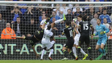 Un doblete, con chilena incluida, del delantero salvó a los de Conte de encajar su primera derrota ante el Swansea