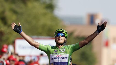 Empezó entonces la estrategia del Quick Step, probablemente el mejor equipo del mundo en materia de preparar una llegada masiva. Trentin no iba solo, llevaba dos asistentes de lugo, el luxemburgués Jungels y el francés Alaphilippe. Casi nada. Jungels reventó a 2 de meta, y el galo le llevó hasta la pista de despegue de Tomares, la ciudad dormitorio de Sevilla separada de la capital por las aguas del Guadalquivir, donde dicen que la temperatura es 2 grados menos que en la ciudad hispalense.