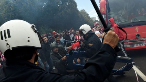 Los incidentes se produjeron a la llegada del autobús del Sporting al estadio de El Molinón, cuando un grupo de ultras comenzó a lanzar objetos contra los agentes.