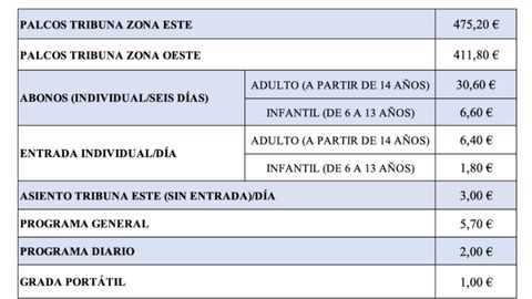 El director del evento deportivo, Pablo Blanco, detalló el sistema de venta que arrancará el 1 de julio en la web oficial con la disponibilidad de abonos para la tribuna este (30,60 euros para adultos y 6,60 euros para menores de 6 a 13 años). Las entradas diarias (6,40 euros adultos / 1,80 euros niños) y abonos sin asiento se podrán adquirir a partir del 18 de agosto.