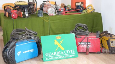 Continuando con las investigaciones y tras autorizar el Juzgado de Instrucción nº 4 de Gijón, en funciones de Guardia, la entrada y registro en su domicilio, se pudo recuperar una sierra eléctrica, dos motosierras, una afiladora, un soplete, dos compresores, una lijadora, un grupo electrógeno, dos taladros, una radial, dos sierras de calar y una lijadora orbital. Además, se han recuperado las cuatro cortadoras de plasma.