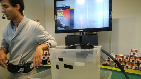 Desde Italia, el vendedor consigue aglutinar a una buena cantidad de gente alrededor con un invento creado para afilar cuchillos, tijeras, brocas y cualquier herramienta con un taladro. Para ello, el kit se compone de un aparato que fija el taladro a una mesa, con varias posiciones según lo que se quiera afilar, y cuya pieza principal es una muela de cerámica que facilita un afilado efectivo. Y así lo demuestra el vendedor con cada pieza que va afilando. El kit cuesta 25 euros y, como curiosidad, en el puesto se han agotado las piezas que permitían que cualquier botella se convierta en un pulverizador.