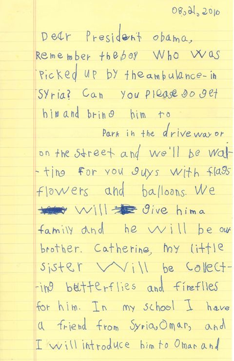«Querido presidente Obama, ¿recuerda al niño que fue recogido por la ambulancia en Siria? ¿Podría ir a buscarlo y traerlo a nuestra casa...? Aparquen en la calle y estaremos estaremos todos esperando con banderas, flores y globos. Le daremos una familia y él será nuestro hermano», comienza una misiva que no solo ha llegado a las manos del mismísimo presidente de Estados Unidos, sino que ha conseguido conmocionarle.