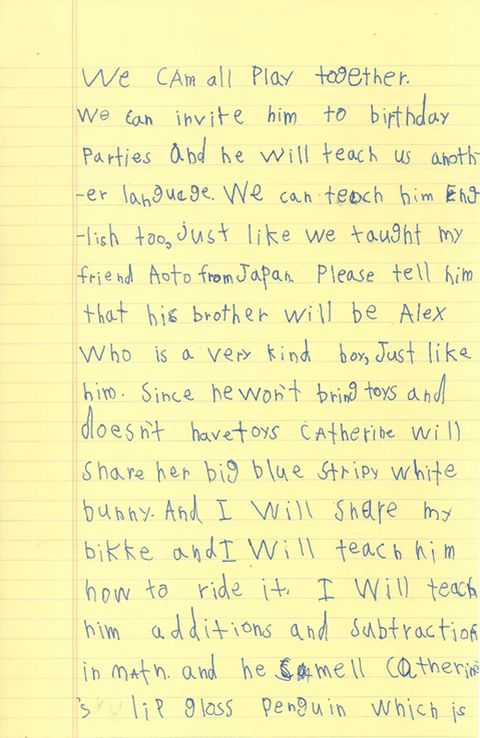 «Catherine, mi hermana pequeña, cazará mariposas y luciérnagas para él. En mi escuela, tengo un amigo que es de Siria, Omar. Le presentaré a Omar y podremos jugar todos juntos. Le invitaremos a fiestas de cumpleaños y él nos enseñará otro idioma. Nosotros podemos enseñarle inglés, como hicimos con mi amigo japonés Aoto», continúa el escrito de un pequeño que demuestra encontrar fácil solución a esos conflictos a los que muchos líderes llevan tiempo dando vueltas. «Como no traerá juguetes, porque no tiene ninguno. Catherine compartirá con él su peluche azul, yo le prestaré mi bicicleta y le enseñaré a usarla. Le enseñaré a sumar y restar y él podrá usar el pingüino verde de Catherine, que no deja que nadie toque. Muchas gracias, estoy deseando que lleguen», termina la increíble carta.
