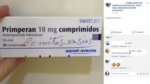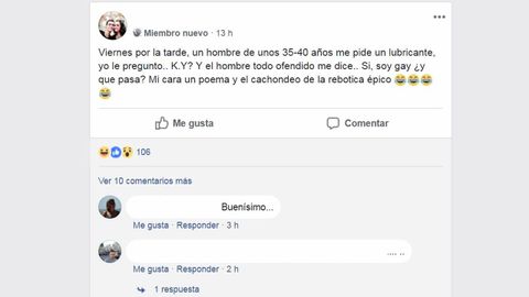Pero no solo dudas de recetas. En el grupo también hay muchas anécdotas. «Ayer mismo a un compañero. Un chico le pide lubricante íntimo... Y le pregunta el farmacéutico, ¿K-Y? (es un lubricante muy típico) y le dice... Sí... Soy gay... Pero no creo q sea relevante».