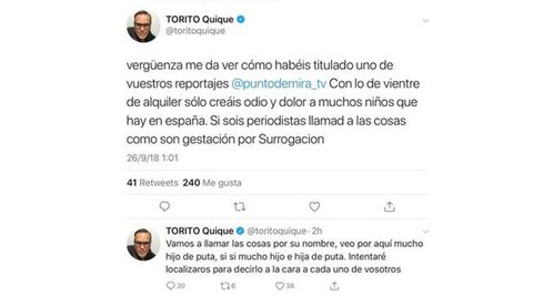 Y la cosa no paró ahí. El colaborador de Viva la vida, que tuvo a su primer hijo mediante una gestación subrogada, se dirigió agresivamente a los que criticaban su postura: «A todos los que estáis en contra solo os puedo decir: iros a tomar por culo infelices», sentenciaba en un mensaje publicado en Twitter el 28 de septiembre y que borró poco después.