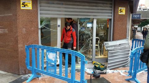 La fuerza del impacto ha empujado la furgoneta contra la entrada del establecimiento de telefonía, ocasionando daños en su puerta y su escaparate.