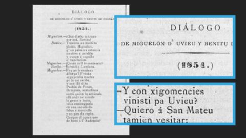A principios de los años 50 del siglo XIX, hay también una referencia escrita sobre el uso de Uviéu. La Revista Asturias publica por aquel entonces un diálogo en asturiano del abogado y poeta gijonés José Napoléon Acebal en el que Miguelón de Uviéu le pregunta a Benito de Candás si «con xigomencies viniste a Uviéu». «Quiero a San Mateo tamién vesitar», responde el candasín. En esa misma revista, en el año 1858 se utiliza el topónimo tradicional de la capital asturiana para indicar el capítulo en el que se va a informar sobre los cantares y romances del concejo de Uviéu.
