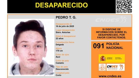 30 jul 2025 . Actualizado a las 13:15 h.La Policía Nacional ha activado una alerta de búsqueda para localizar a Pedro T. G., un joven de 22 años desaparecido en Siero (Asturias) el pasado 16 de julio de 2025.