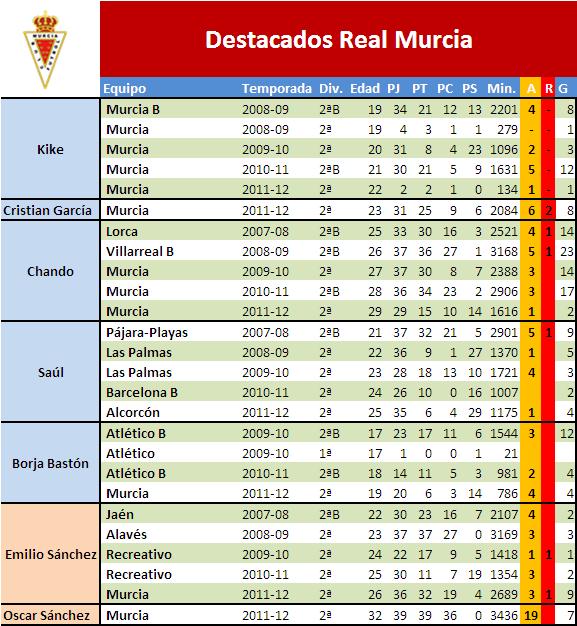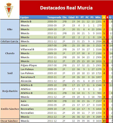 Os dejo con un listado de los actuales jugadores del Murcia con más pegada y sus números de las últimas temporadas.