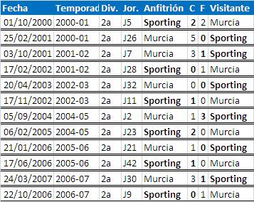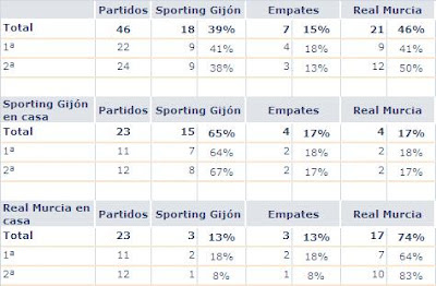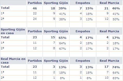 En un total de 44 ocasiones en la historia de la Liga, se han medido el Sporting y el Murcia desde el 12 de Enero de 1930, en el que el Sporting se impuso por 3-2 y el 9-0 de la segunda visita de los pimentoneros a Gijón. Y 2 de promoción, en la que el Sporting superó a los murcianos. Aunque el global de enfrentamientos, no nos es favorable, en El Molinón, los 3 puntos suelen quedarse en casa. Solamente han conseguido ganar en 4 de las 23 visitas a El Molinón, el Sporting se ha llevado los 3 puntos en 15 ocasiones, por 4 empates y 4 victorias visitantes.