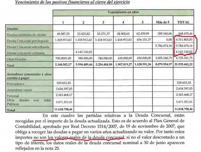 Desconozco el motivo, pero la información que sale en prensa normalmente se refiere, con más o menos acierto, a la deuda concursal, que como hemos visto es sólo una parte de la deuda total. Dicha cantidad no se puede cuantificar a simple vista en el balance, si no que hay que buscar en la Memoria que acompaña a las cuentas y en ella encontraremos un cuadro donde veremos que asciende a 16,2 M. Más adelante se vuelve a hablar con más detalle sobre la deuda concursal, y se nos explica que esa cantidad de 16,2 M está calculada en función de una norma de valoración concreta, pero que lo que realmente se deben son 18,61 M. (+2,4 M)