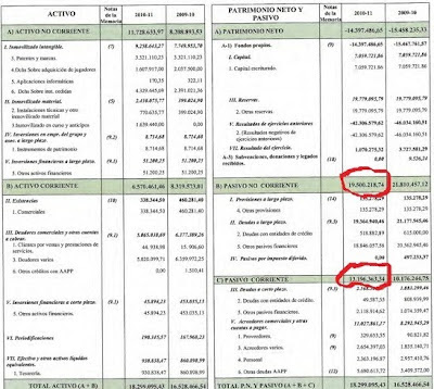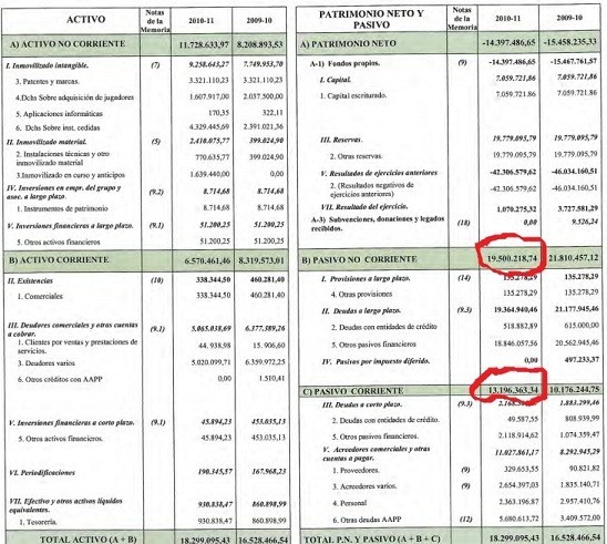 Si miramos la parte derecha del Balance, encontramos casi de inmediato lo que debe el Sporting. Basta con mirar la columna 2010-2011 en lo que se refiere a Pasivo no Corriente y Pasivo Corriente. Las primeras son las deudas a largo plazo (más de un año para pagarlas) y ascienden a 19, 5 Millones y las segundas son las de corto plazo (menos de un año) y suman 13,19 M. Agregando las dos cantidades, nos sale una deuda total de 32,7 M, cantidad muy similar a la que nos dice el profesor Gay de Liébana (probablemente los datos los sacó del balance del 2010).