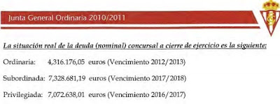 - Deuda concursal: Cantidad que se debe actualmente a los acreedores del proceso concursal. Como sabéis hace unos años ante los impagos del club, se entró en un Proceso Concursal acordándose unas cantidades a pagar en unos determinados plazos. Evidentemente, el importe de la deuda concursal está comprendido dentro de la deuda total.