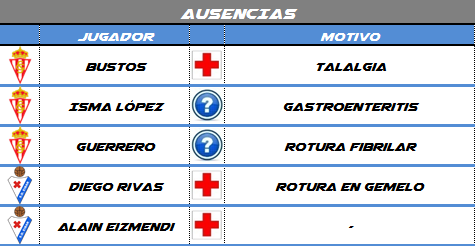 El Eibar se está mostrando inexpugnable en Ipurua y los estados de forma pueden condicionar este cambio, siendo el resto de hombres elegidos los ya titulares frente al Alavés. Además los 445 metros cuadrados menos respecto a El Molinón tampoco podrían descartar que finalmente Alberto Lora sea el sacrificado en favor del juego directo y aéreo que podría esperarse.
