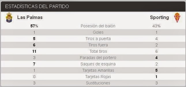 -El Sporting se llevó un meritorio punto del estadio de Gran Canaria en un partido marcado por la expulsión de Juan Muñiz. Los locales llevaron el peso en la segunda parte y lograron igualar el gol de Jony gracias a Sergio Araujo.