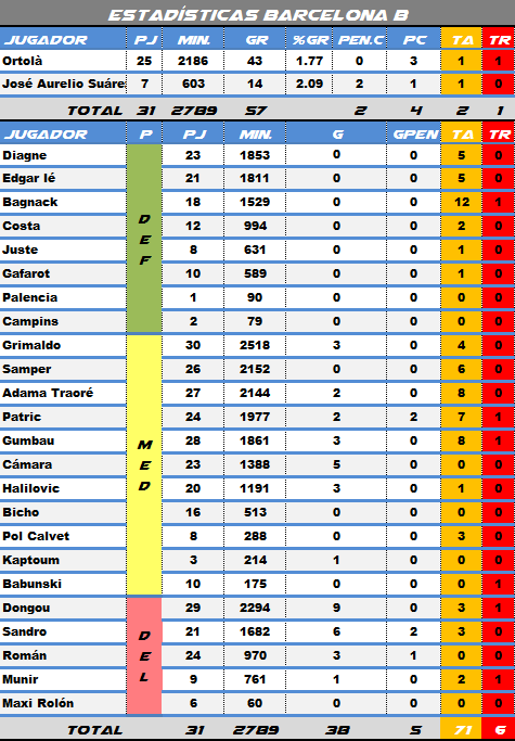 Posible alineación del Barcelona B: Suárez; Palencia, Ié, Juste, Grimaldo; Samper, Gumbau, Cámara; Adama, Sandro y Munir.