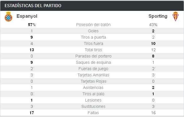 Inciencias: partido televisado en directo para 72 países de los diversos continentes; entre las plataformas que lo transmiten en España, la de Telecable para Asturias. El Sporting jugó con su indumentaria suplente, enteramente de color amarillo. Lora ofició de capitán rojiblanco y Víctor Sánchez lo hizo por el Espanyol. De los 19 jugadores convocados por Abelardo quedó fuera de la lista Mendigutxia. Unos 21 grados de temperatura en Cornellá-El Prat en noche agradable. Presencia de un centenar de seguidores rojiblancos en la esquina destinada a la afición rival.