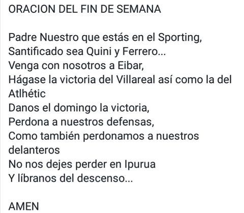 Menu La Voz de Asturias Inicia sesión Mi cuenta Sporting 1905 Tema libre Archivo La oración sportinguista para la permanencia que se hace viral Redacción GIJÓN SPORTING 1905 Fueyo Está teniendo gran éxito en Whatsapp 13 may 2017 . Actualizado a las 18:30 h. Whatsapp Mail Facebook Twitter Archivado en: Sporting de Gijón Whatsapp Mail Facebook Twitter