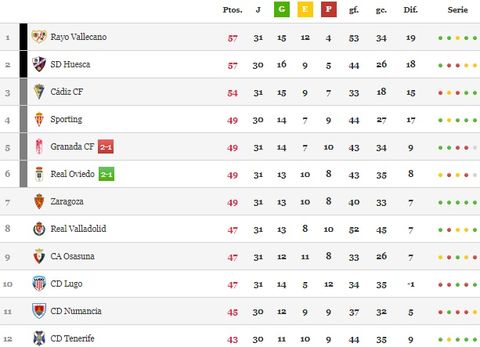 Con 49 puntos se quedan empatados el Sporting, el Granada, el Zaragoza y el Oviedo. Sin embargo, los rojiblancos salen beneficiados por el golaverage general que ha logrado con sus goleadas en El Molinón durante el año 2018.