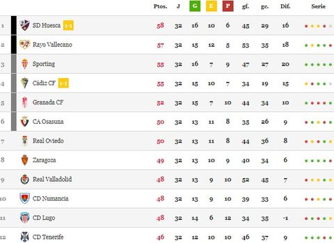 Los rojiblancos han recortado 2 puntos más al Huesca, que sigue su negativa con 6 jornadas consecutivas sin ganar; 2 puntos al Cádiz, que cae a la cuarta posición por el golaverage general al haber anotado menos tantos; y otros 3 puntos al Rayo Vallecano, que llegó a Gijón como líder y cayó derrotado en El Molinón - Enrique Castro Quini.