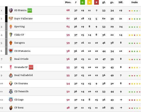 28 abr 2018 . Actualizado a las 22:12 h.El Real Sporting de Gijón sale de la zona de ascenso directo a Primera División al ganar el Huesca de Rubi en la visita del Granada a su estadio.