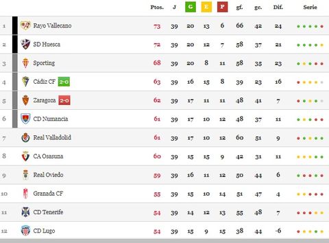 14 may 2018 . Actualizado a las 23:00 h.El Real Sporting de Gijón se ve beneficiado por la derrota del Zaragoza en Cádiz, puesto que los maños se podían poner a 3 puntos de distancia de los rojiblancos con el golaverage en contra de la escuadra asturiana.