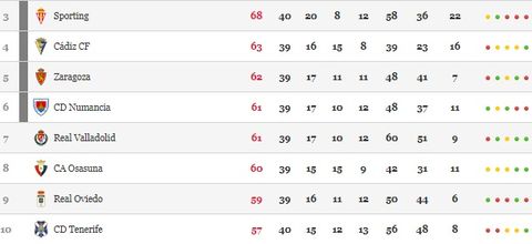 - Cabe reseñar que el Numancia se encuentra en la sexta plaza y el Sporting necesita marcar la diferencia de más de 6 puntos con el séptimo.