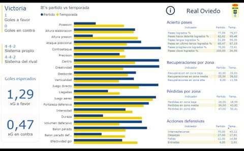 El Oviedo sí parece que fue el que más adaptó su planteamiento de partido en busca de condicionarlo a su favor. Consciente de las virtudes del Sporting y de dónde podría ganarle la partida (duelos individuales, juego directo, centros laterales..), modificó considerablemente ciertos aspectos clave de su juego como son la presión alta, cediendo todo el protagonismo con balón a los rojiblanco y fio claramente sus opciones en ataque a desarmar las fortalezas de los de Gallego: exprimió al máximo las contras, el juego directo y los centros laterales. Potenciar todas estas cuestiones le acercó al éxito, empleó mayor dureza en defensa para imponerse en los duelos individuales y sacó del partido a un Sporting poco reconocible. Ziganda supo llevar el choque al terreno que más beneficiaba al conjunto carbayón, y sin ser un partido brillante ni mucho menos en cuanto a juego, tampoco sufrió ante un rival desactivado.