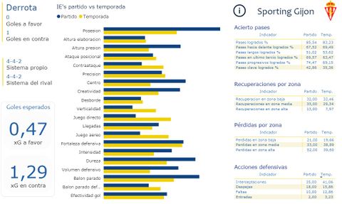 Para analizar qué factores modifican de su juego Sporting y Oviedo cuando les toca enfrentarse entre sí hemos tomado como referencia el big data que nos ofrece Alebia del último derbi, comparando las métricas obtenidas de dicho encuentro respecto a las del resto de la temporada. Si bien la muestra es muy escasa (tan solo un partido), hemos decidido hacerlo así por el cambio importante en los paradigmas de juego de Gallego respecto a los técnicos que lo precedieron en derbis de años anteriores.