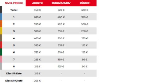 Los precios han variado respecto a la campaña de abonados del verano y en varias zonas existe un descuento respecto a los precios de la temporada completa. Por ejemplo, en la categoría de adulto en la Grada Este sectores A G H, se pasa de 435 euros a 335. Y en la Tribuna Oeste sectores A I, de 505 euros a 385.