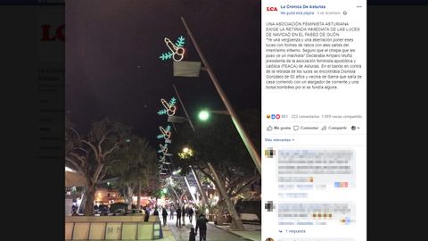 El origen del texto sobre las luces de Gijón está en la página satírica La crónica de Asturias. En él se afirma que una asociación feminista había reclamado retirar las luces con declaraciones como «'ye una vergüenza y una aberración poner eses luces con formes de rabos con ales salíes del mismísimo infierno. Seguro que el chispa que les puso ye un machista'. Declaraba Amparo Muñiz presidenta de la asociación feminista apostólica y católica (FEACA) de Asturias. En el bando en contra de la retirada de les luces se encontraba Dionisia González de 93 años y vecina de Sama que salía de casa corriendo con un alargador de corriente y una bolsa bombilles por si se fundía alguna».