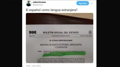 La extraña interpretación de lo publicado en el BOE y que ha llevado a Foro a presentar hasta cuatro preguntas en el parlamento, surge de un tuit publicado por el periodista ultra Cake Minuesa, que horas antes de que el partido casquista anunciara su iniciativa había difundido un mensaje, con una captura de la primera página de la noticia del BOE y un breve comentario en el que se cuestionaba «El español como lengua extranjera? (sic)». Posteriormente, y a medida de que varios usuarios de la red socia, le explicaran que se trataba de un acuerdo para la enseñanza de español a extranjeros terminó por borrar el tuit. Sin embargo, Foro siguió adelante con su iniciativa.