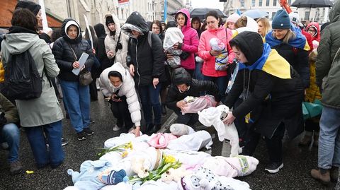 Con banderas ucranianas y muñecos, como símbolo de las víctimas de la guerra, centenares de mujeres se manifestaron hoy en Budapest en la llamada Marcha de las Madres por Ucrania.