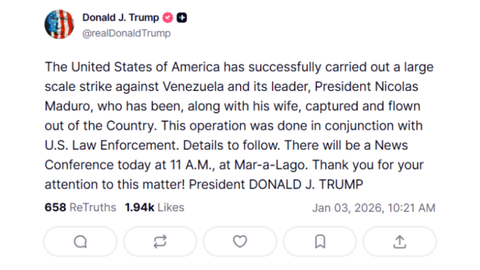 En el mensaje publicado en Truth Social, Trump afirmó: «EE.?UU. ha llevado a cabo con éxito un ataque a gran escala contra Venezuela y su líder, el presidente Nicolás Maduro, que, junto con su esposa, ha sido capturado y trasladado en avión fuera del país. Esta operación se ha realizado conjuntamente con las fuerzas del orden de EE.?UU. Detalles más adelante. Habrá una rueda de prensa hoy a las 11.00 en Mar-a-Lago. Gracias por su atención a este asunto».