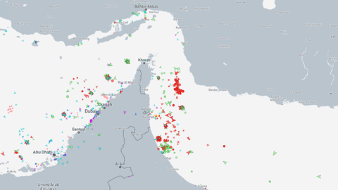 Este es el aspecto en tiempo real que presenta el tráfico marítimo en el estrecho de Ormuz, con grandes acumulaciones de cargueros a uno y otro lado del estrecho. Se trata de uno de los puntos claves del conflicto, por donde pasa buena parte del suministro petrolífero mundial.