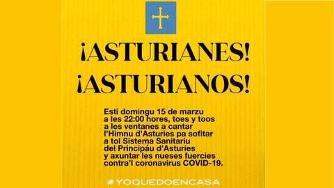 Diversos perfiles enredes sociales están lanzando la propuesta de cantar el himno de Asturias a las ventanas, mañana, domingo, a las diez de la noche. El objetivo es reconocer la labor que están relizando los equipos de la sanidad asturiana y a modo de acompañamiento durante el periodo de aislamiento.