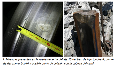En las primeras conclusiones de la Comisión de Investigación de Accidentes Ferroviarios se establece que las muescas fueron encontradas en los coches 2, 3, 4 y 5 del Iryo y son compatibles con un impacto en la cabeza del carril: al estar interrumpida la continuidad del carril, la parte anterior a la rotura recibiría inicialmente el peso total de la rueda, provocando que esa parte del carril descendiese levemente. Se produciría así momentáneamente un escalón entre los dos lados de la fractura, que golpearía la llanta de la rueda.