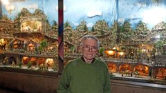 Carlos Estévez es el autor de una filigrana de 50 años que despliega en el escaparate de su comercio; este año se puede ver de milagro por problemas de salud, «pero San Pedro no me quiso allá arriba»