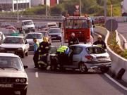 El coche dejó una frenada de 140 metros antes de empotrarse contra la valla del paso subterráneo Dos jóvenes de Betanzos, V. A. F. R, de 19 años, y J. F. R., de 21, resultaron ayer por la tarde levemente heridos después de un aparatoso accidente en el túnel de Os Castros, en sentido entrada en A Coruña. Los muchachos viajaban en un coche que empezó a perder el control en la bajada del viaducto de As Xubias, a la altura del concesionario Renault. Después de chocar contra la mediana y dejar una marca de frenada de, al menos, unos 140 metros se empotraron contra la valla quitamiedos del acceso al pasadizo subterráneo.