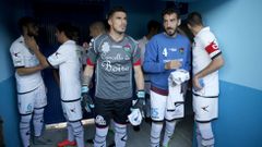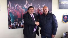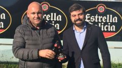 El responsable de Patrocinios de la cervecera, José Villanueva, y el presidente del Boiro, David Places, brindaron por el acuerdo sobre el césped de Barraña