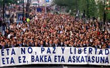 ETA, CONTRA TODOS Ibarretxe, Mayor y Redondo acompañaron a 40.000 guipuzcoanos en una marcha contra el asesinato del directivo de «El Diario Vasco» Los vientos de cambio que asoman por la política vasca tuvieron un impulso más en la manifestación convocada por el lehendakari Ibarretxe para repudiar el asesinato de Santiago Oleaga. Todos los partidos democráticos estuvieron allí. Se pudo ver juntos, dándose la mano y sosteniendo la misma pancarta a Mayor Oreja y a Ibarretxe. «Ya era hora», comentaba una mujer que asistía a la manifestación. Políticos y ciudadanos se concentraron en el Alderdi Eder, donde los líderes tomaron una pancarta en la que se podía leer el lema: «ETA no, paz y libertad». Los representantes fueron recibidos con aplausos.